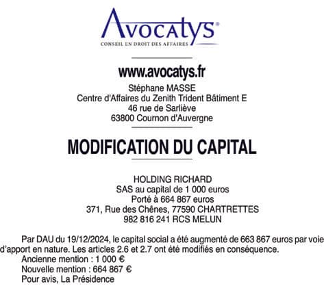 HOLDING RICHARD - AUGMENTATION DE CAPITAL