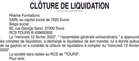 CLÔTURE DE LIQUIDATION - Rhème Formations