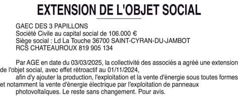 GAEC DES 3 PAPILLONS - EXTENSION OBJET SOCIAL