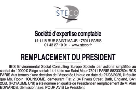 Remplacement Président IBIS ESCE/882332604/STECO/JPJ/DPI/19.03589