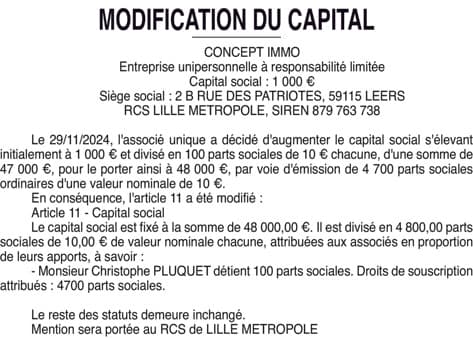 CONCEPT IMMO - AUGMENTATION CAPITAL