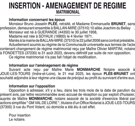 L25EJ26689 INSERTION - AMENAGEMENT DE REGIME MATRIMONIAL